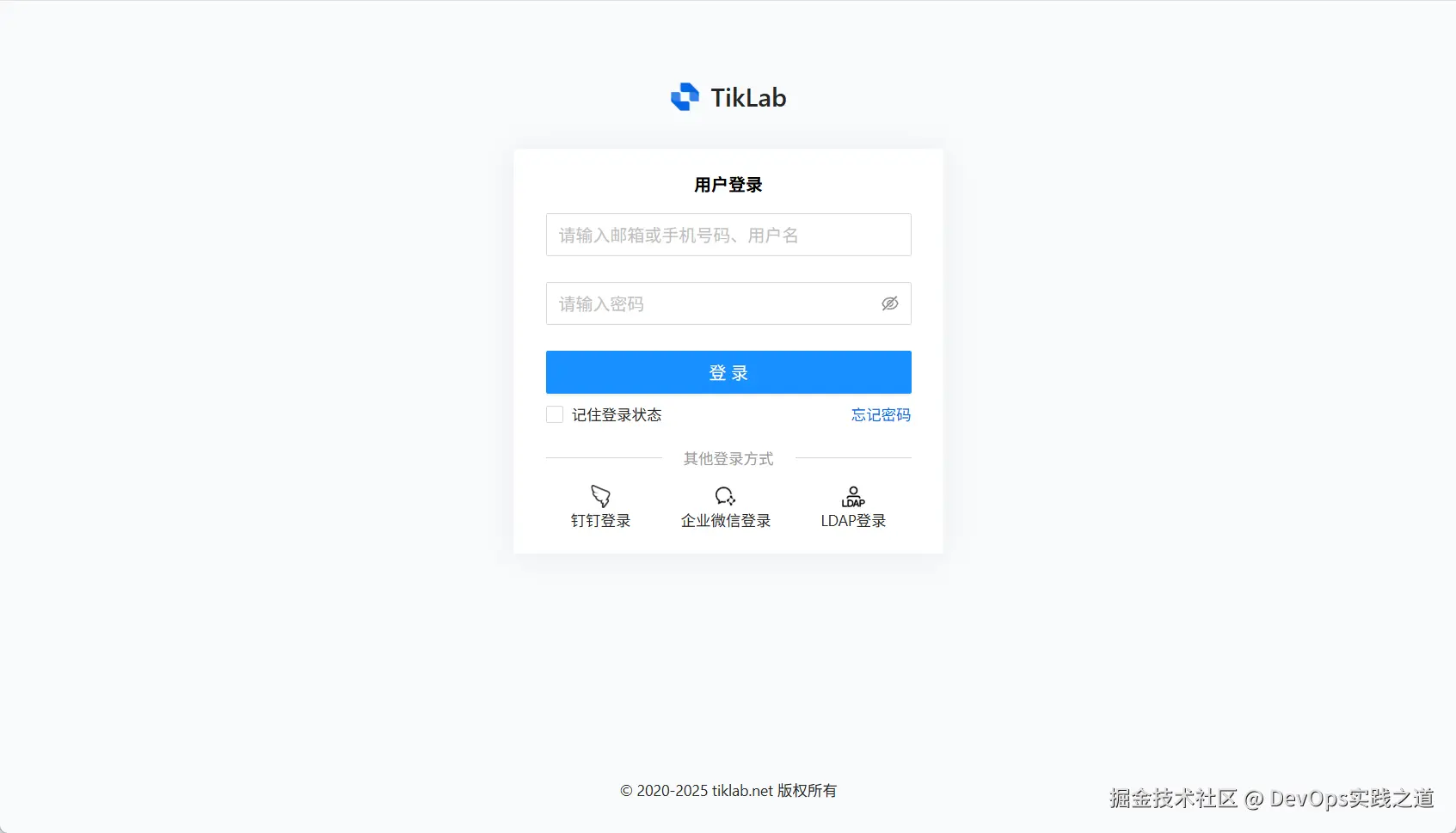 默认支持通过账号密码登录,满足基础登录需求。若需要使用企业微信、钉钉或 LDAP 等高级登录方式,可参阅文档获取相关配置说明。