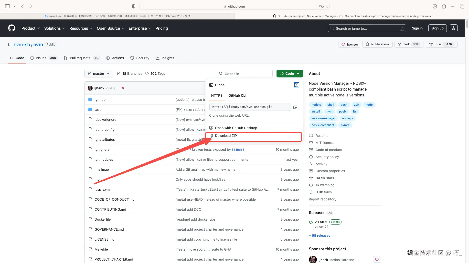 首先,手动安装nvm,先进入他的git下载zip包github.com/nvm-sh/nvm