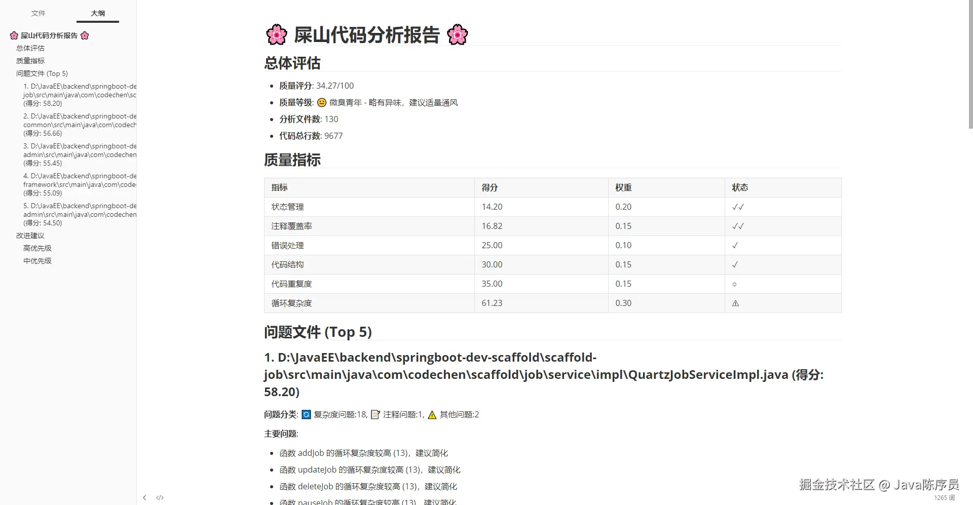 Markdown 报告包含:总体评分/指标表格/问题文件/改进建议。