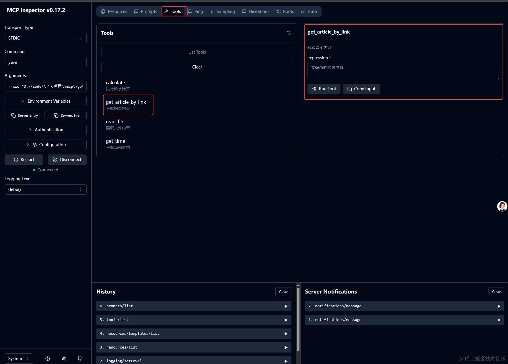 运行启动后,会在那浏览器打开一个本地服务连接http://localhost:6274/,如下图: