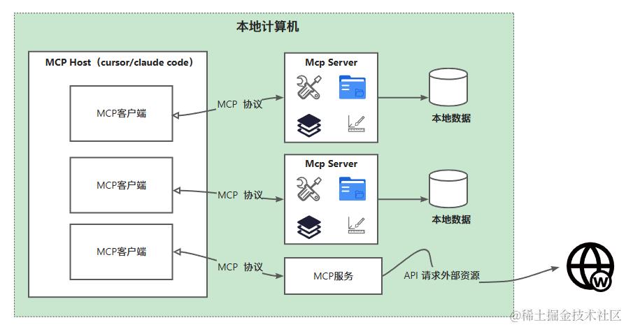 - 远程服务: MCP 服务器可连接的互联网上的外部系统(如通过 APIs)