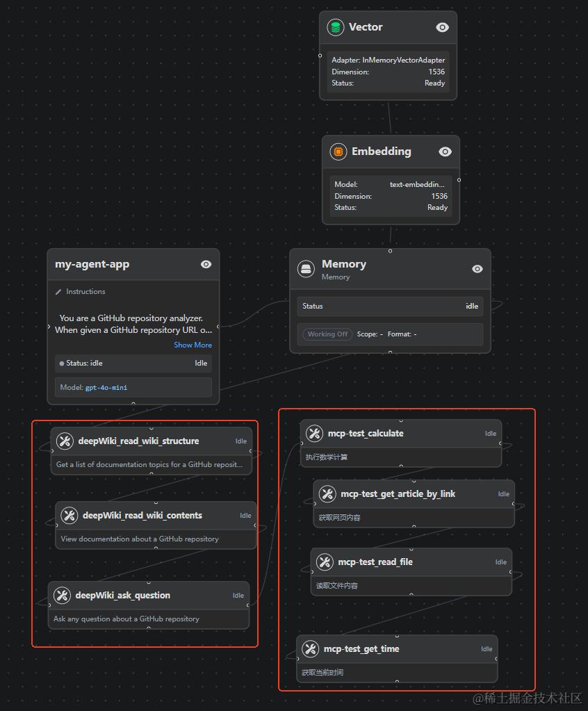 通过上面的配置看我们 MCP服务在 Claude Desktop、IDE、Cursor这些开发者工具中Agent 价值配置后结构,如下图示例(包含外部deepwiki MCP Server 和我们开发的 MCP Server):