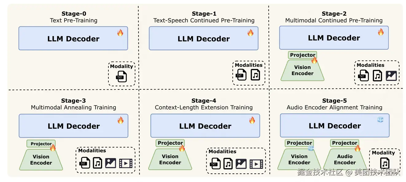 - 阶段 0:大规模文本预训练,利用成熟稳定的大语言模型为后续多模态学习奠定坚实基础;