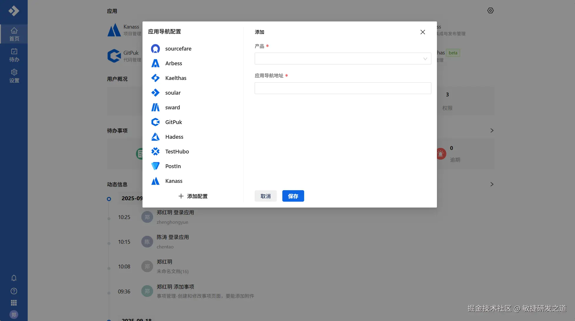 通过配置产品链接,soular可以直接跳转到Tiklab旗下的所有应用。点击首页->应用配置->填写配置信息->保存