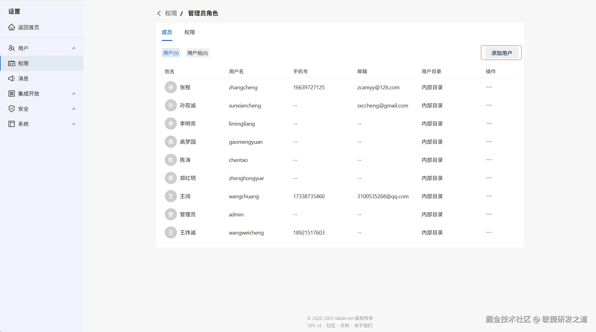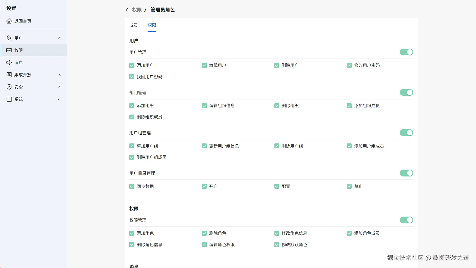 权限->添加角色->确定,角色添加成功。进入角色,可以为角色分配权限,并添加成员