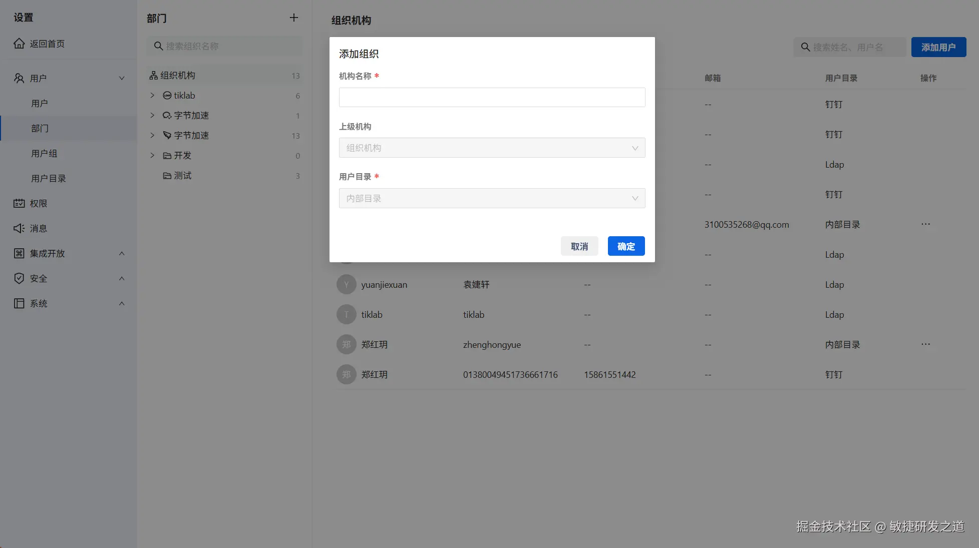 部门->添加部门,系统支持多层部门嵌套。部门添加成功后,点击添加用户,可以将用户添加到部门中。