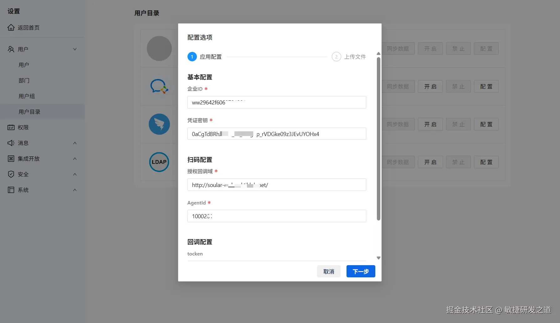 | Tocken | 非必填 | 用于企业微信用户目录变更回调,在企业微信 --> 应用管理 --> 自建应用 -->接收消息中获取。 |