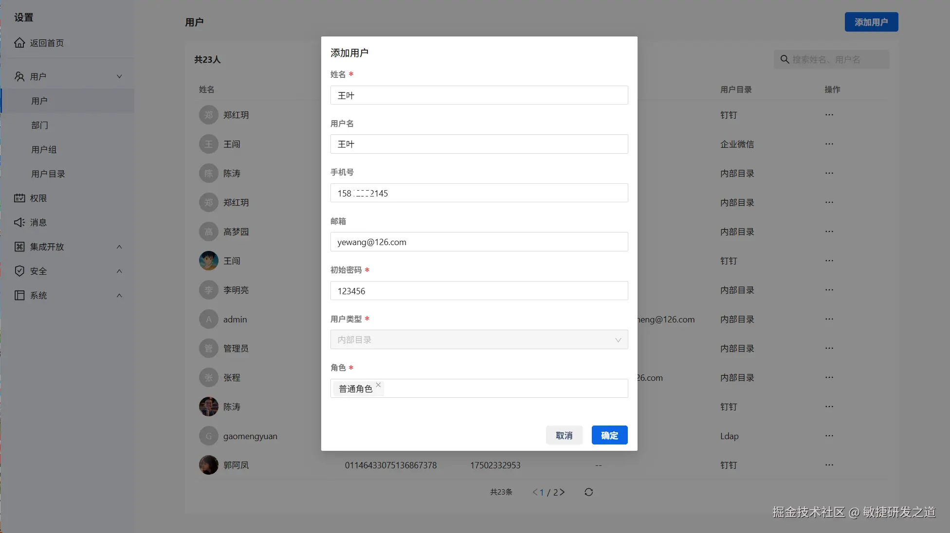 | 角色 | 必填 | 为用户设置角色。系统内置三种角色,但无法添加系统超级管理员 |