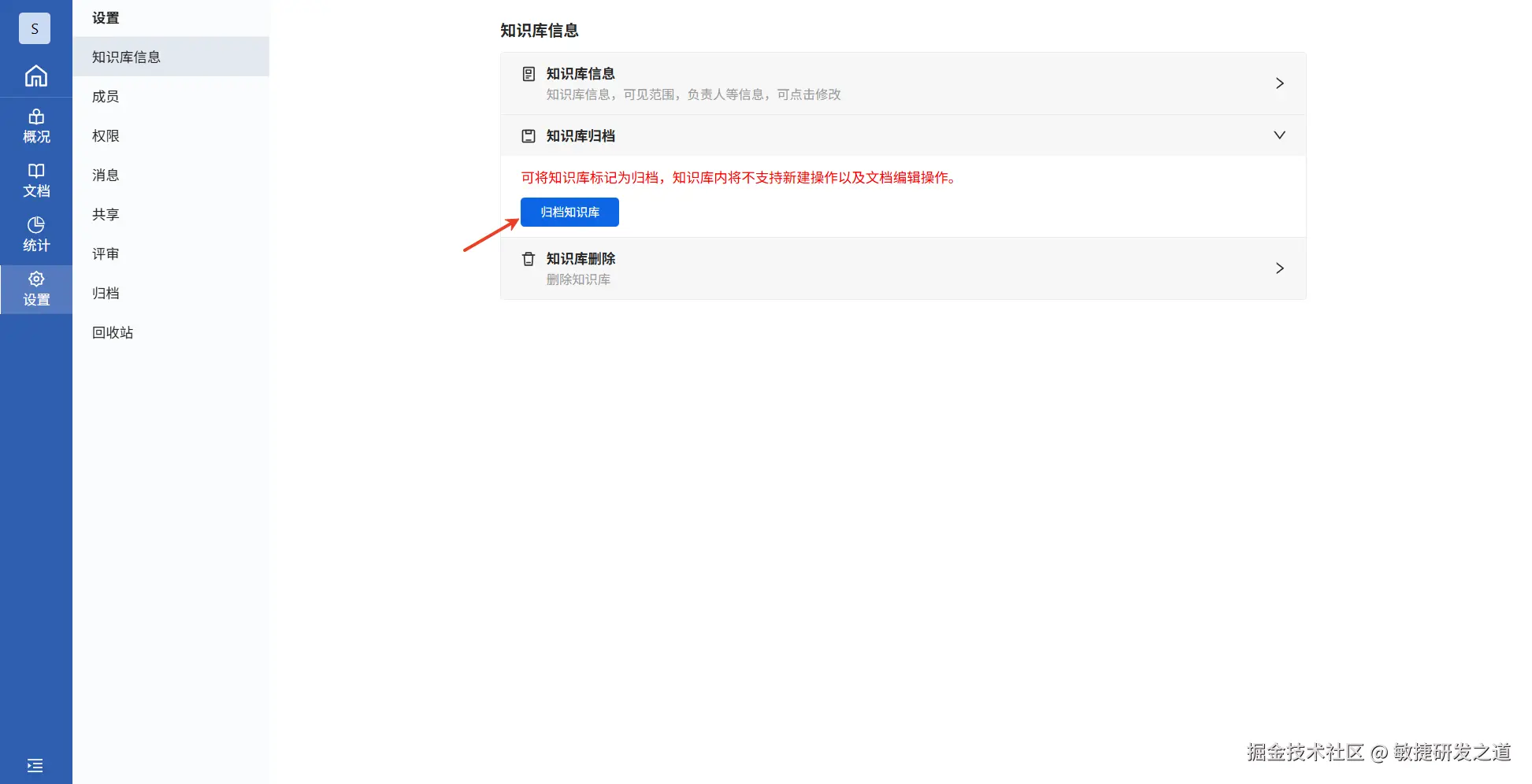 - 归档后的知识库可以取消归档,取消后,知识库可以继续添加文档和目录