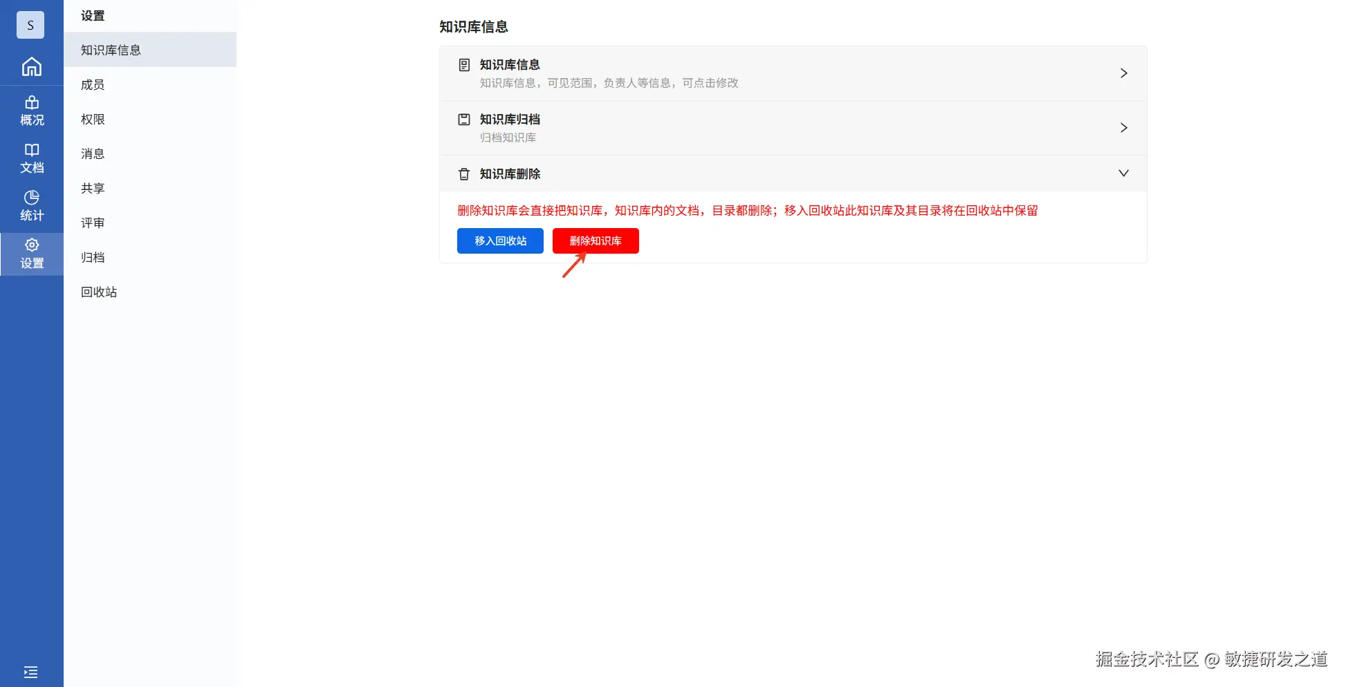 - 删除知识库会直接把知识库、知识库内的文档、目录全部删除