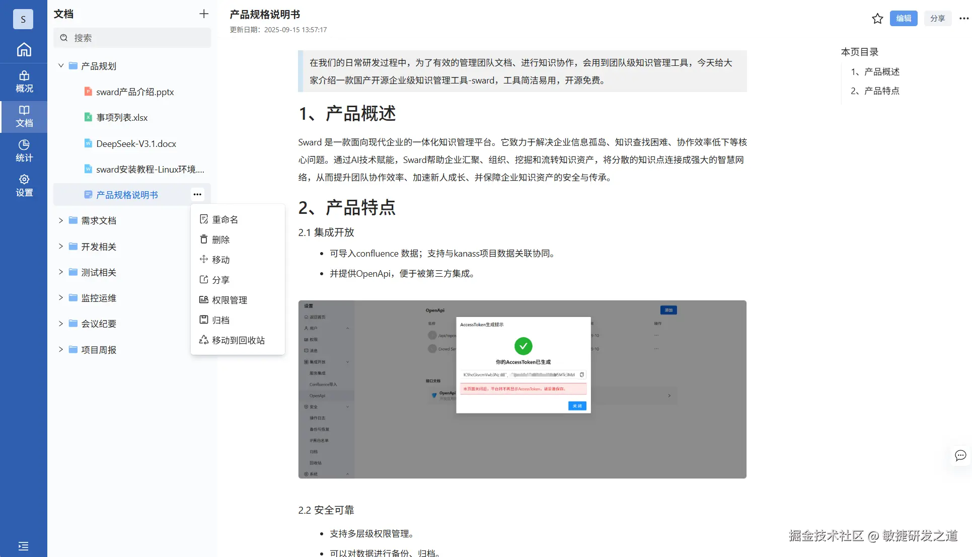 | 归档 | 归档目录,会将目录与目录下的文档一起放入归档页面。支持恢复。位置:知识库设置->归档 |