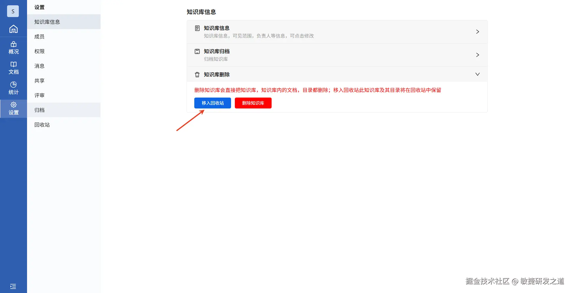 - 将知识库移入回收站,此知识库及其目录将在回收站中保留