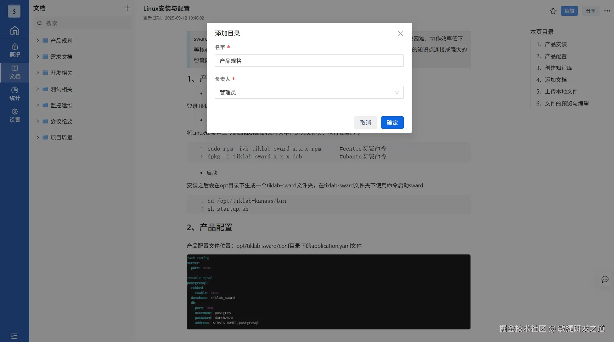 点击目录后的添加按钮,菜单中显示:添加文档、添加markdown、上传本地文件