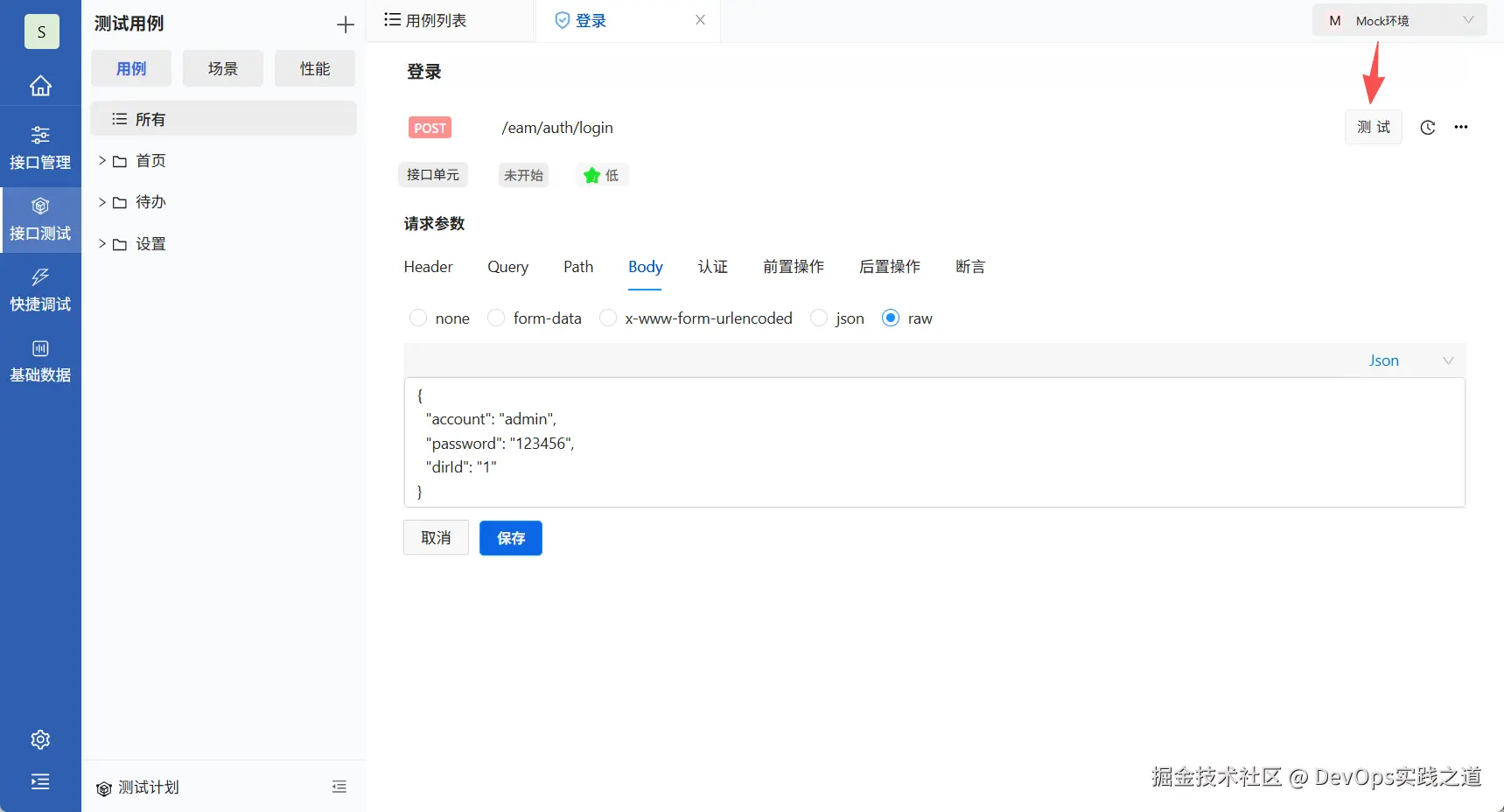 维护接口用例后,点击接口用例名称,进入接口详情编辑,在接口用例详情也可以对接口进行测试。用例测试使用的环境和接口管理一致。用例测试前需要选择用例测试环境,选择环境后点击测试按钮。