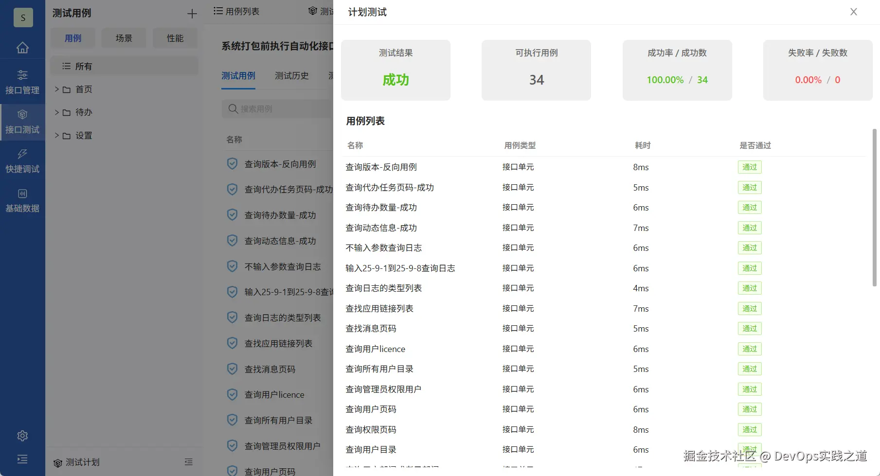 在测试计划选择环境,点击测试,执行测试计划所有用例。弹窗显示测试结果。测试结果包含总体测试结果、执行用例数量、通过/失败数量、通过率/失败率、耗时、以及每个用例执行情况。