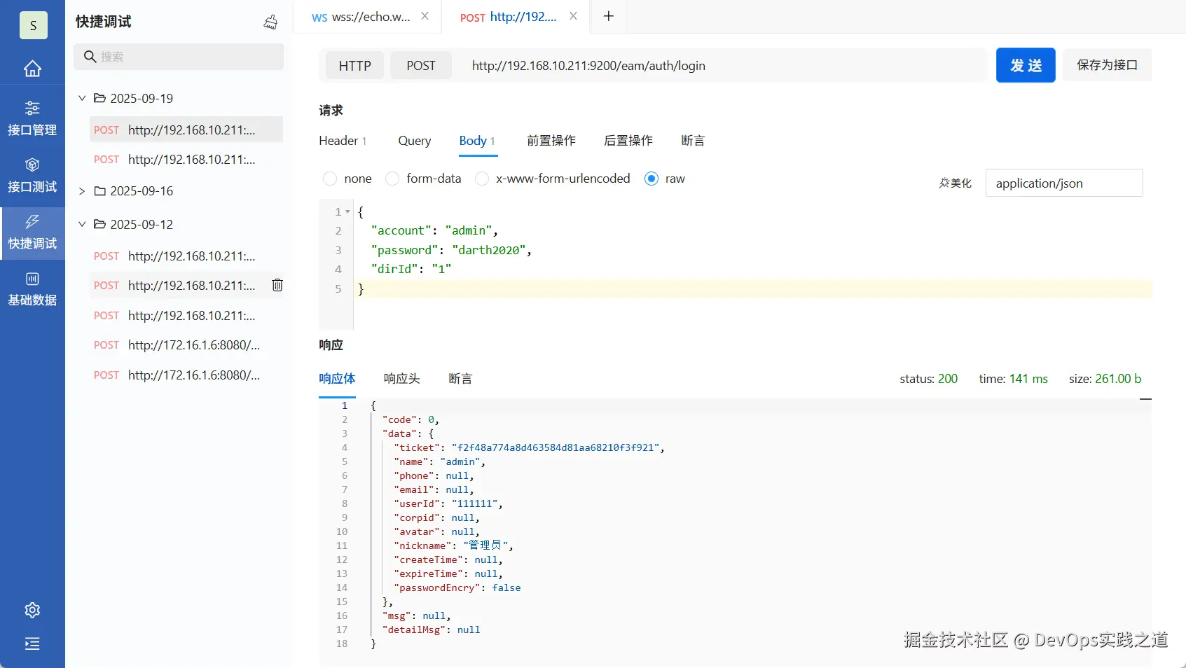 接口每一次调试都会记录在左侧接口调试历史列表,点击调试历史列表,右侧显示调试时设置的参数。