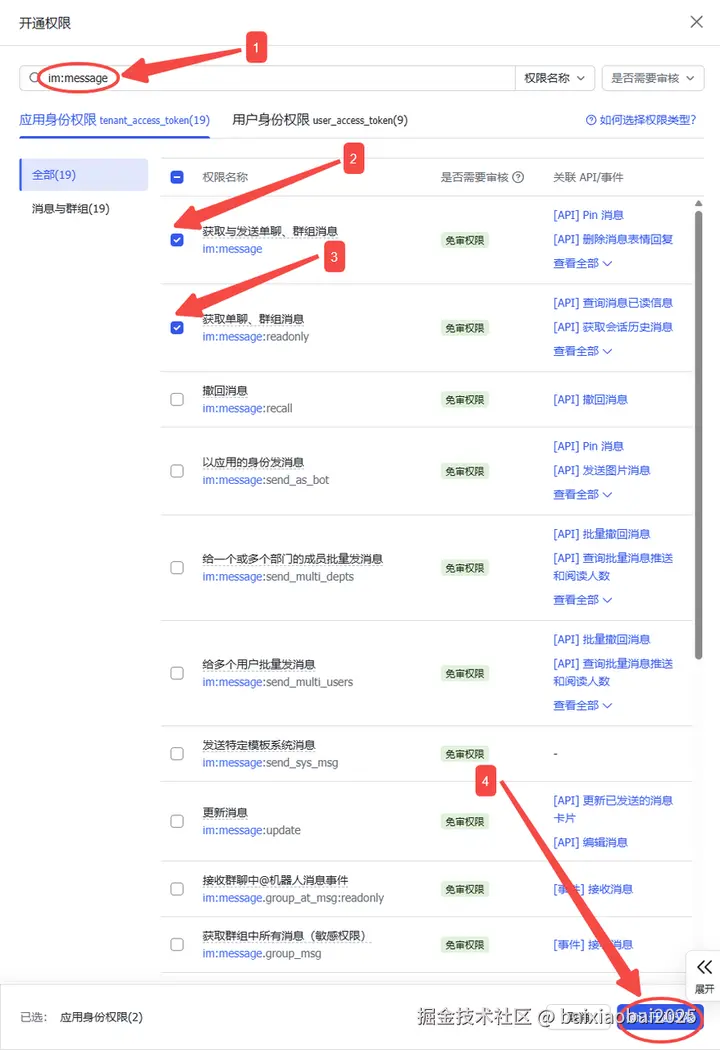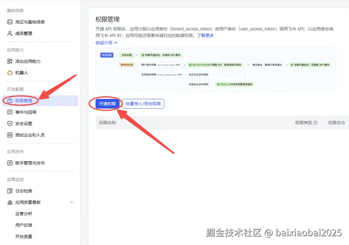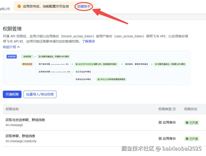 想要agent可以操控飞书的云文档、多维表格、发送群消息,还需要相应的开通权限: