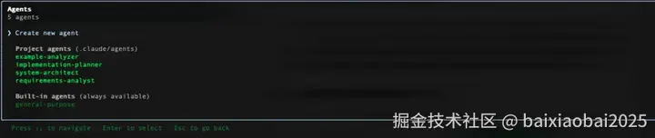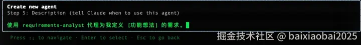 - 创建agent命令:/agents,选择Create New Agent,然后描述这个代理的用途和使用场景