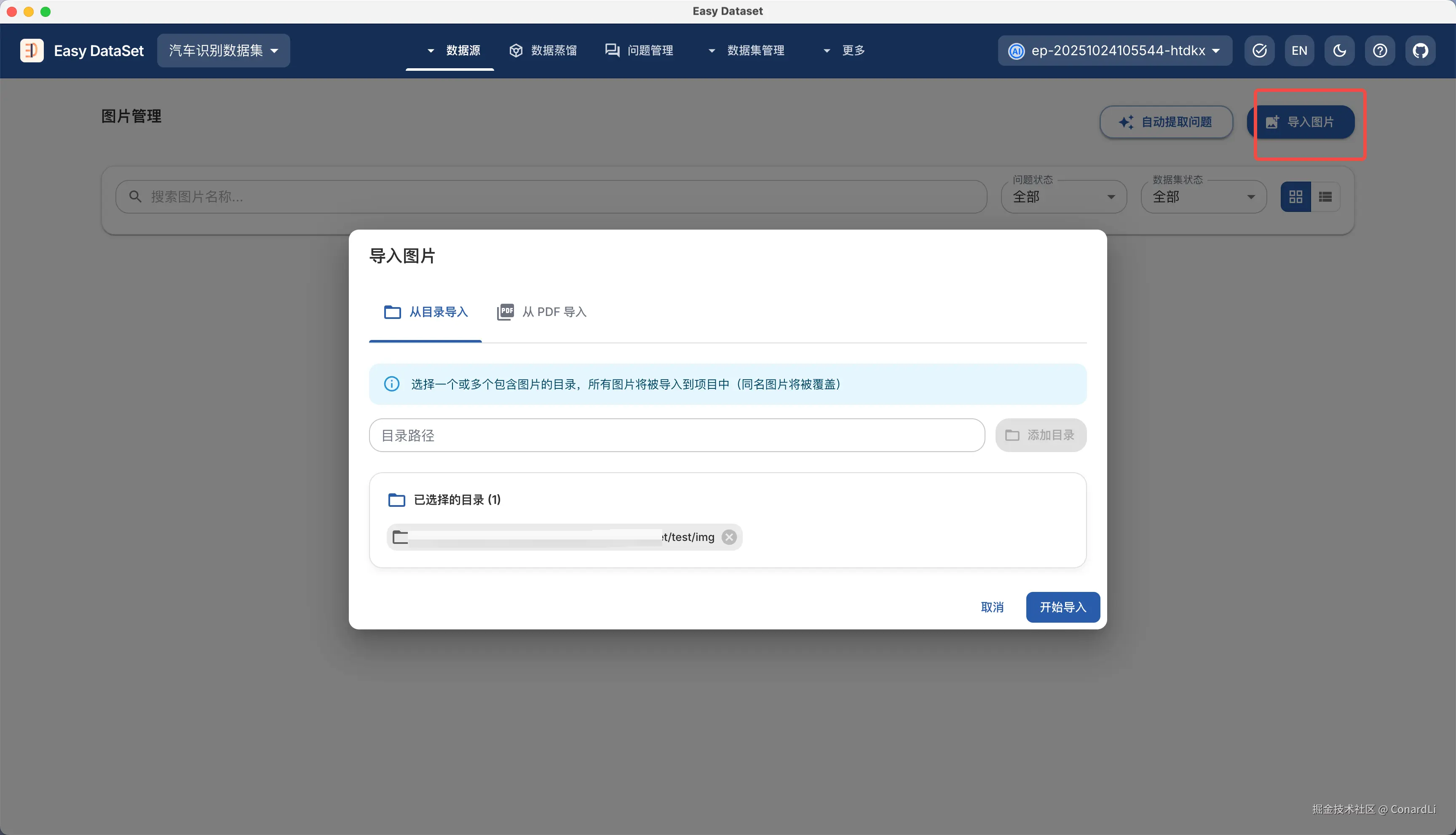 首先进入【数据源 - 图片管理】模块,点击右上角导入图片,这里我们将需要生成数据集的图片目录输入进去(本机的绝对路径):