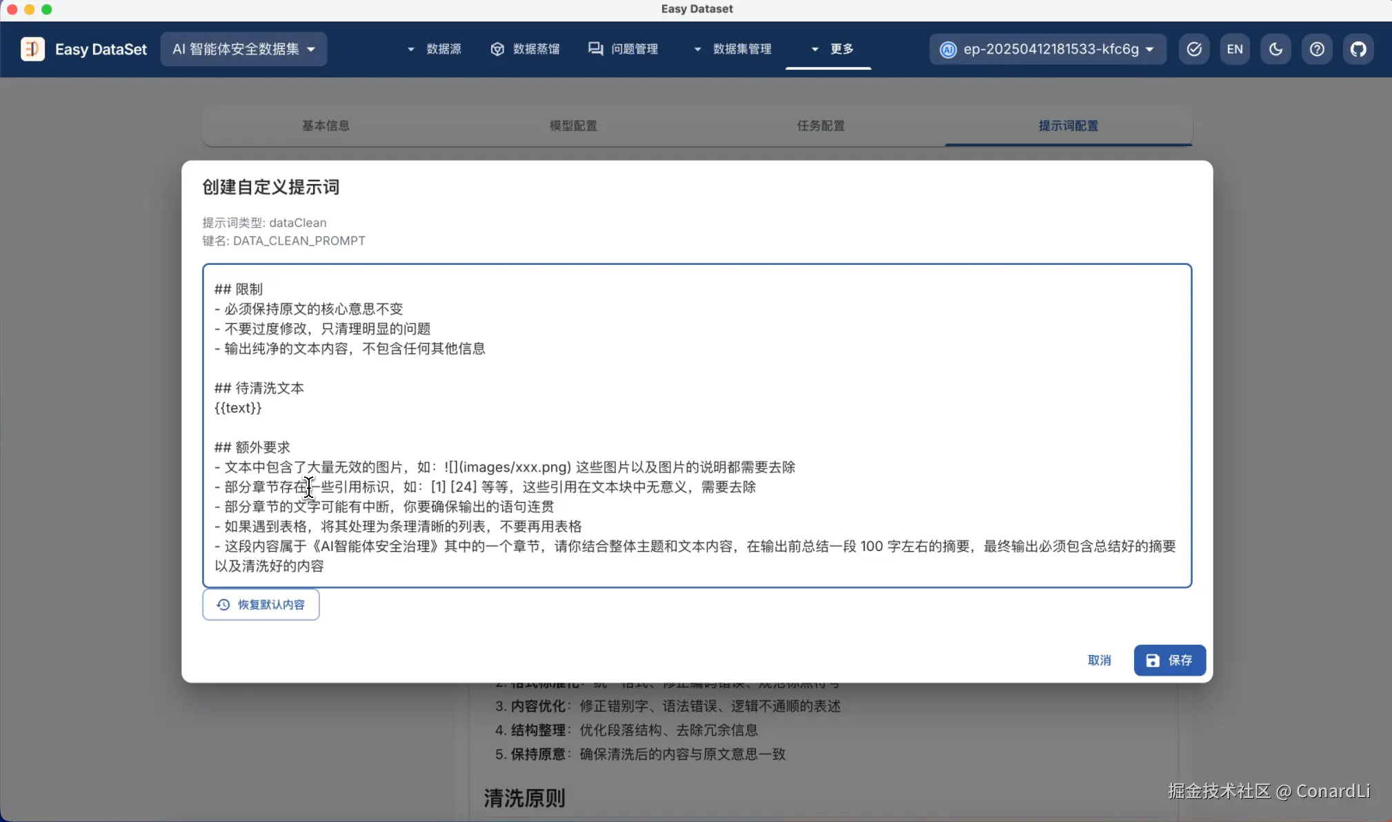 我们先来到自定义提示词模块,看看默认的数据集清洗能力,可以看到,在提示词中说明了一些常见的存在于原始文献中的干扰数据: