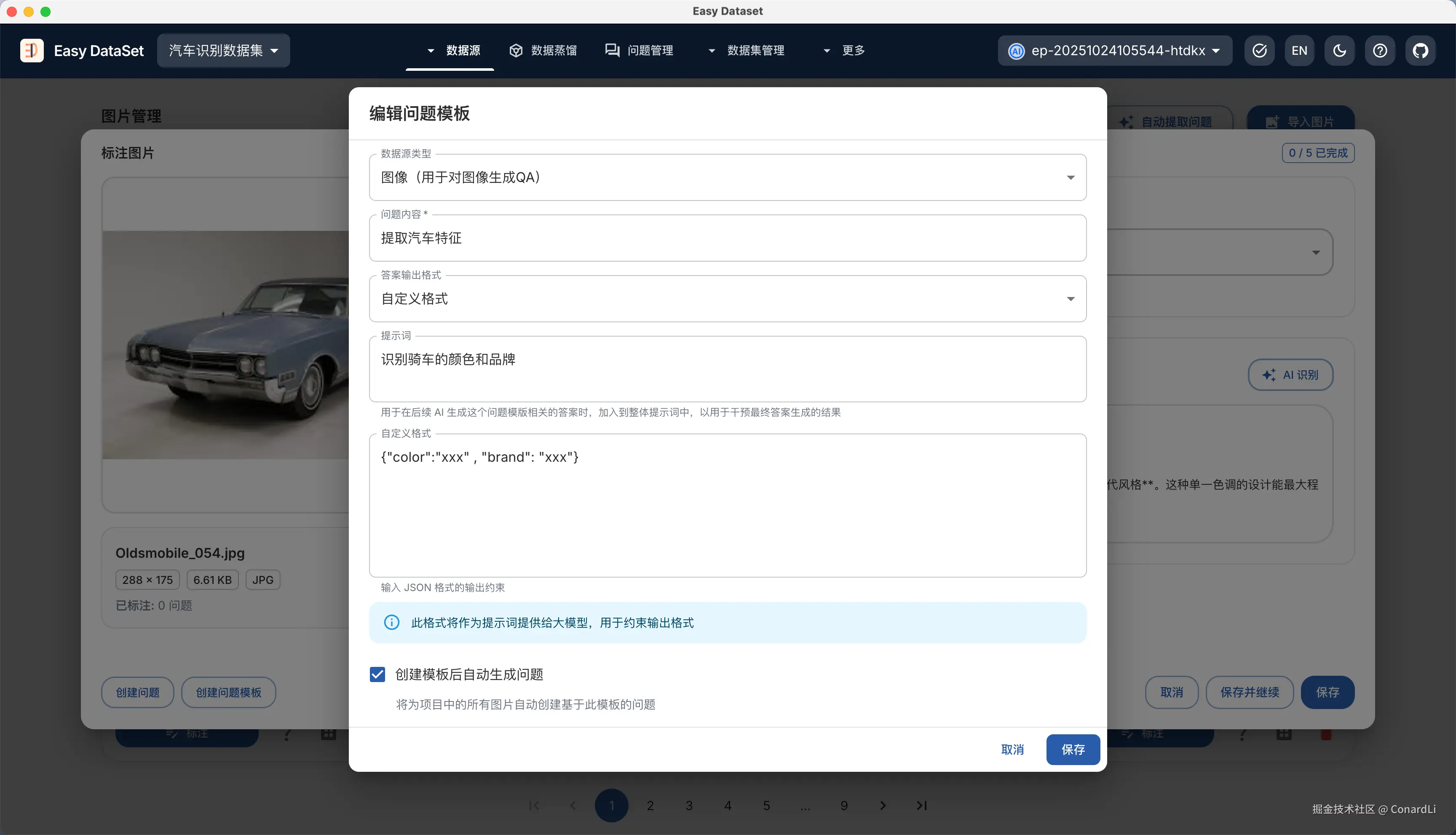 如果嫌手动标注太慢,可以到问题管理模块,点击自动提取数据集 - 生成图像问答数据集,这会自动创建一个后台异步任务: