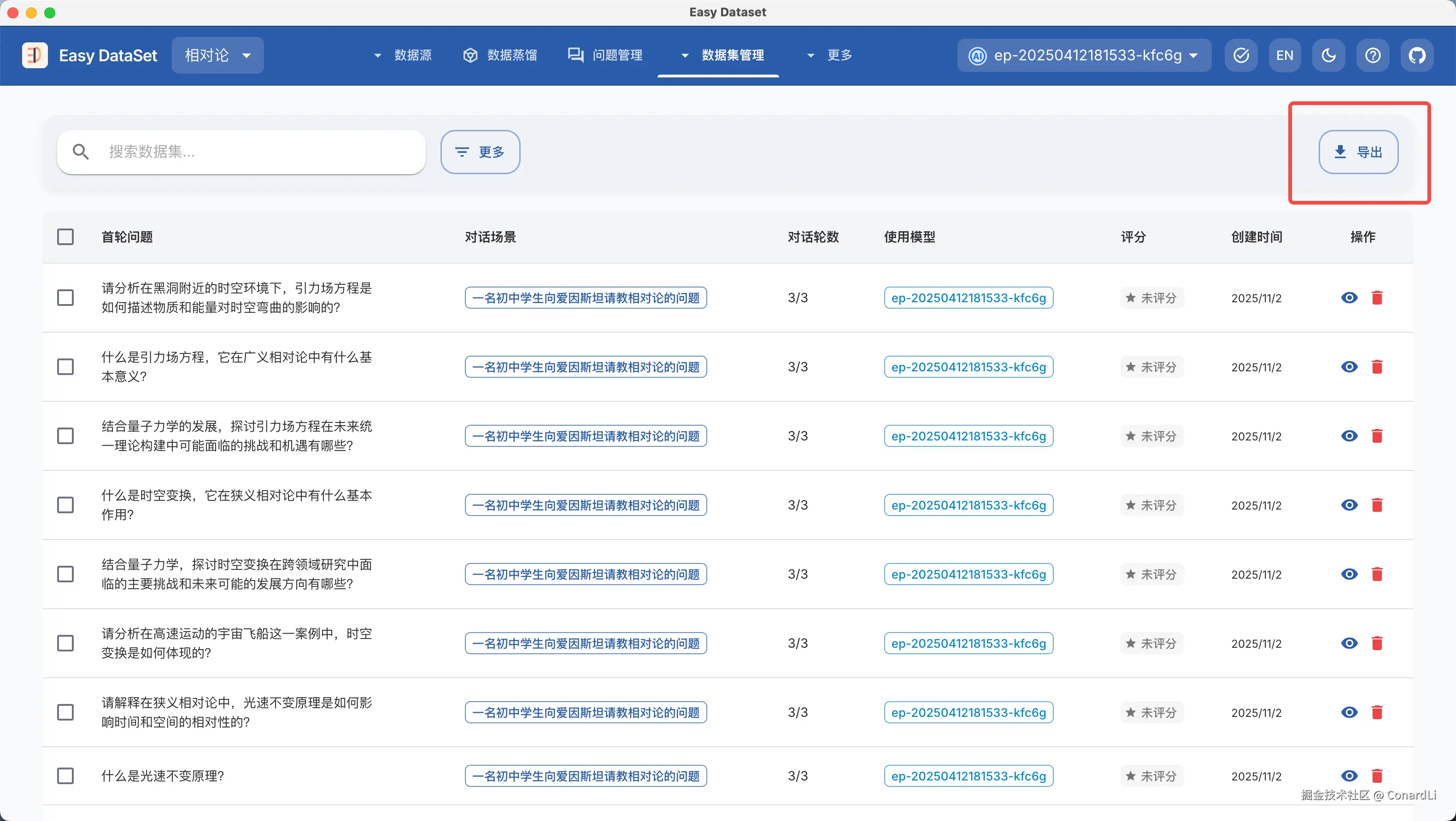 然后我们回到多轮对话数据集,点击导出: