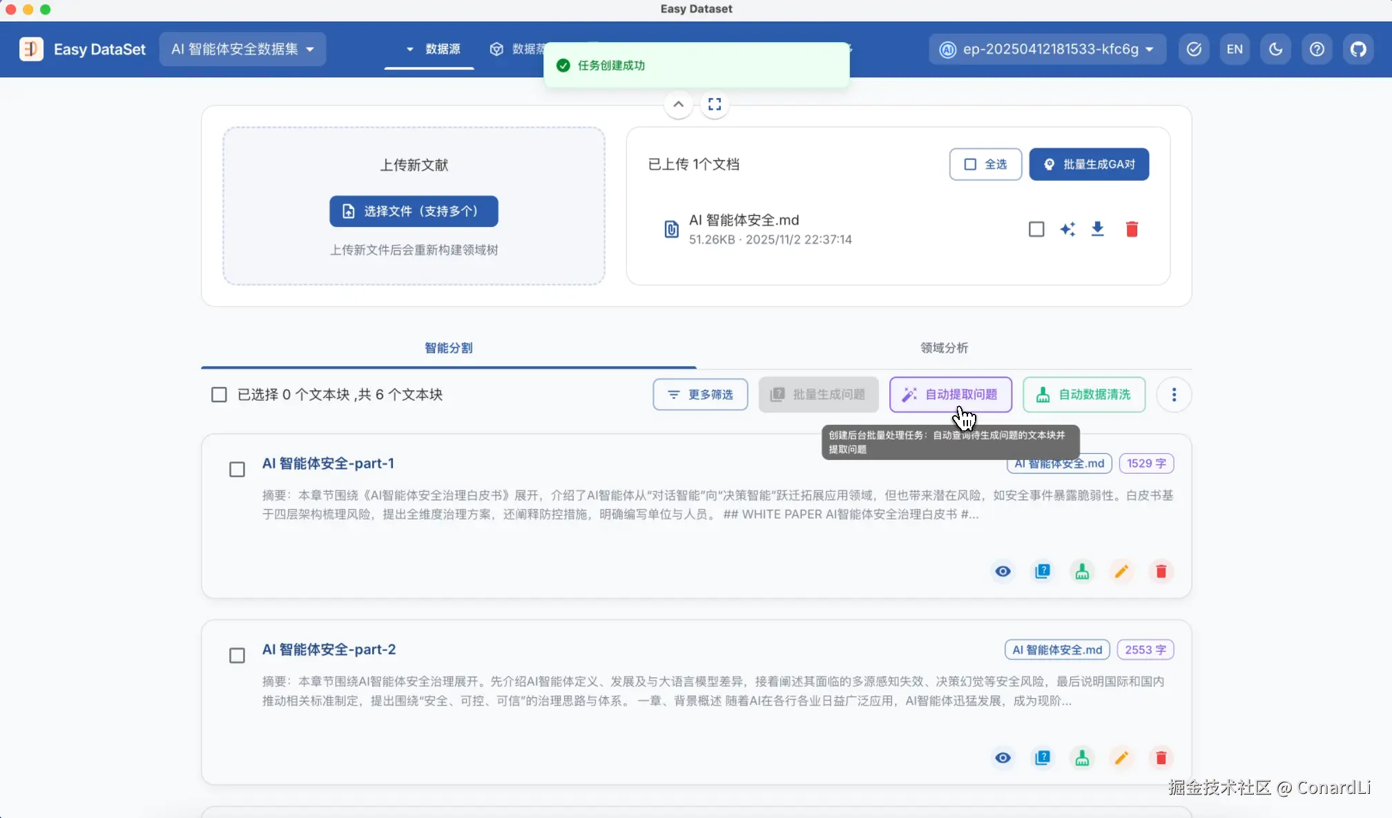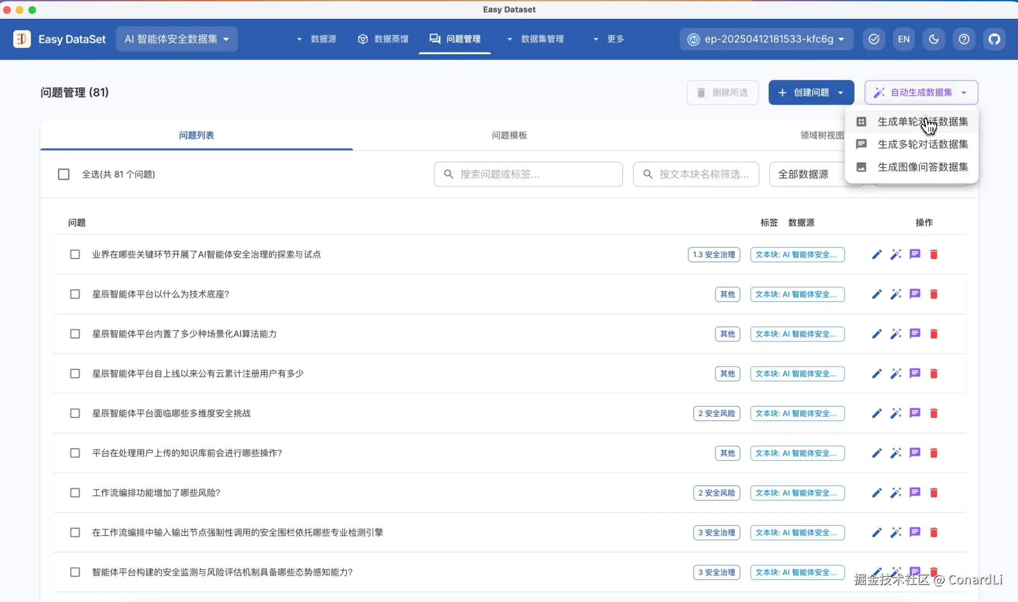 然后我们看到 EDS 为每个文本块都创建了这个问题,我们点击自动提取数据集 - 单轮对话数据集: