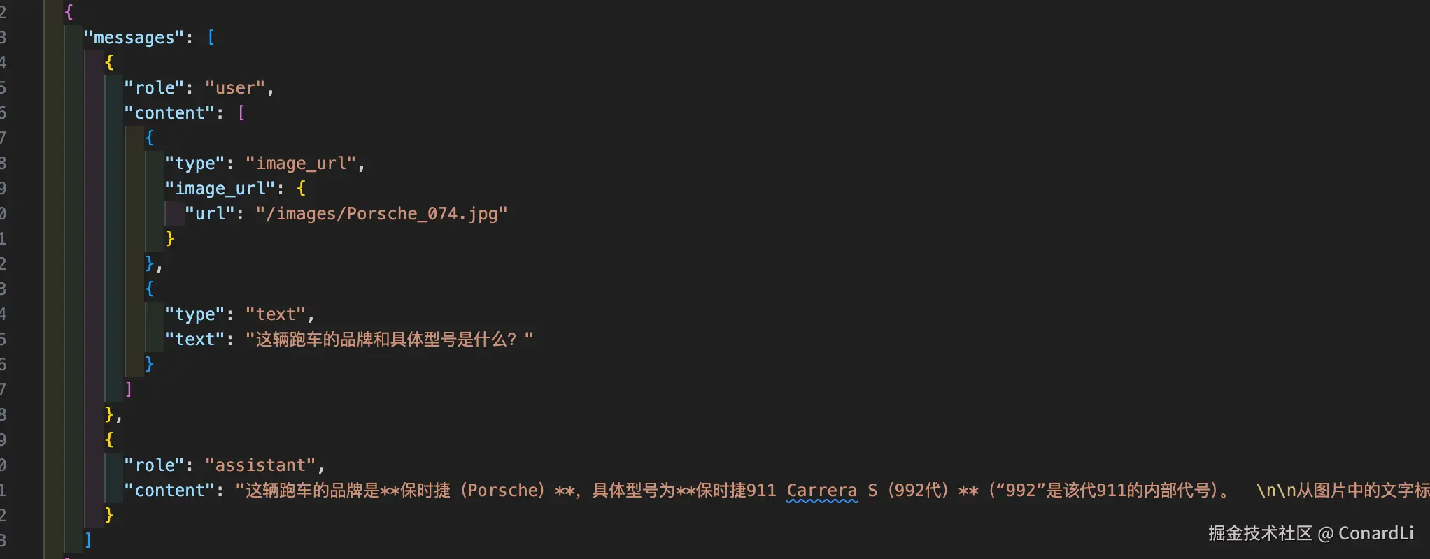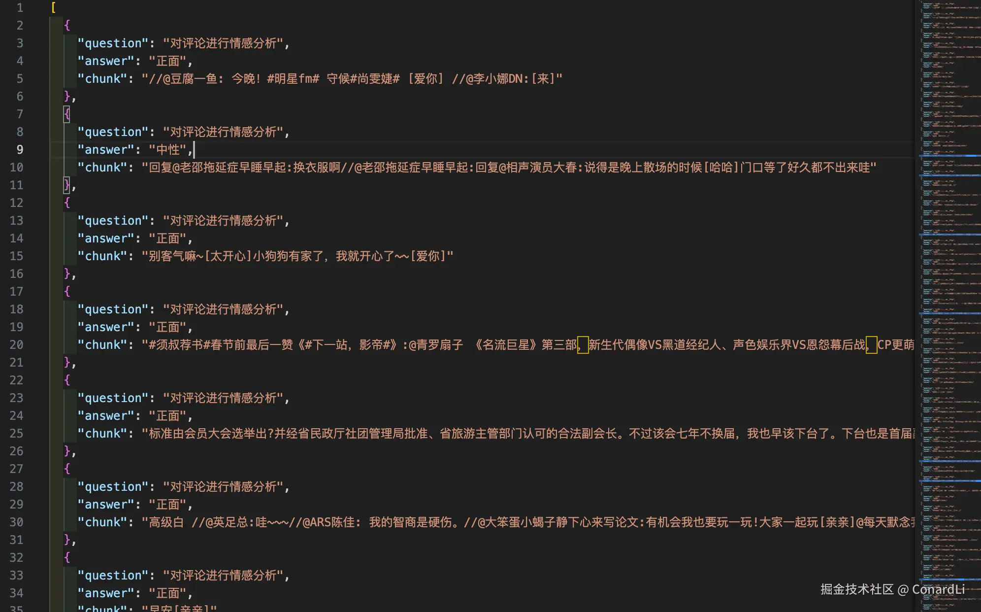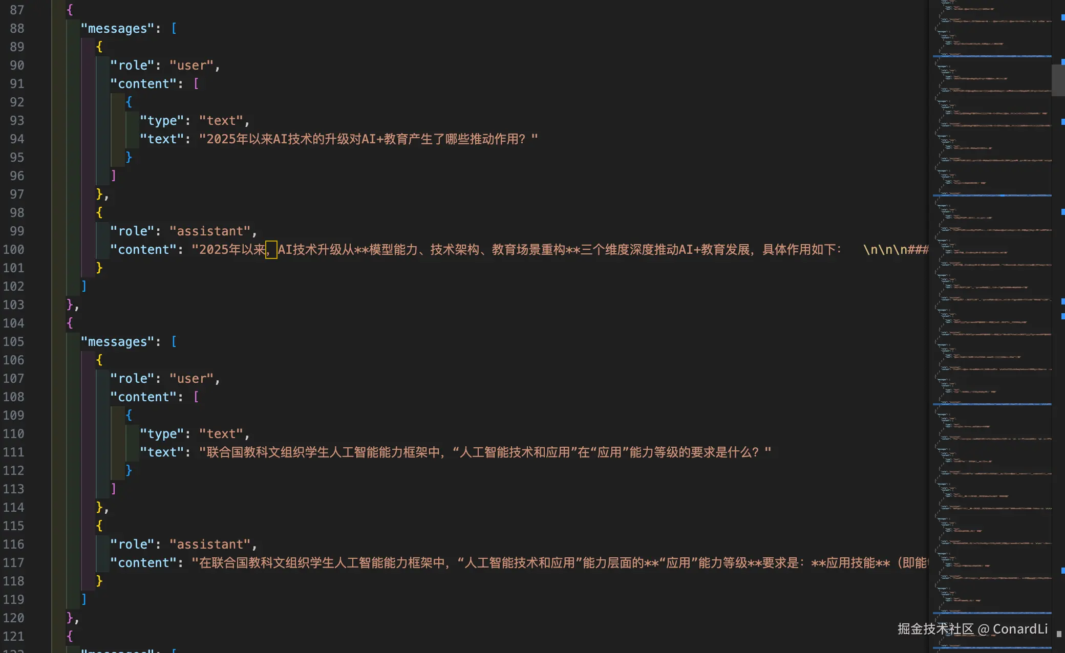 可以看到导出后到数据集,目前只支持导入 Open AI 风格的 JOSN 格式: