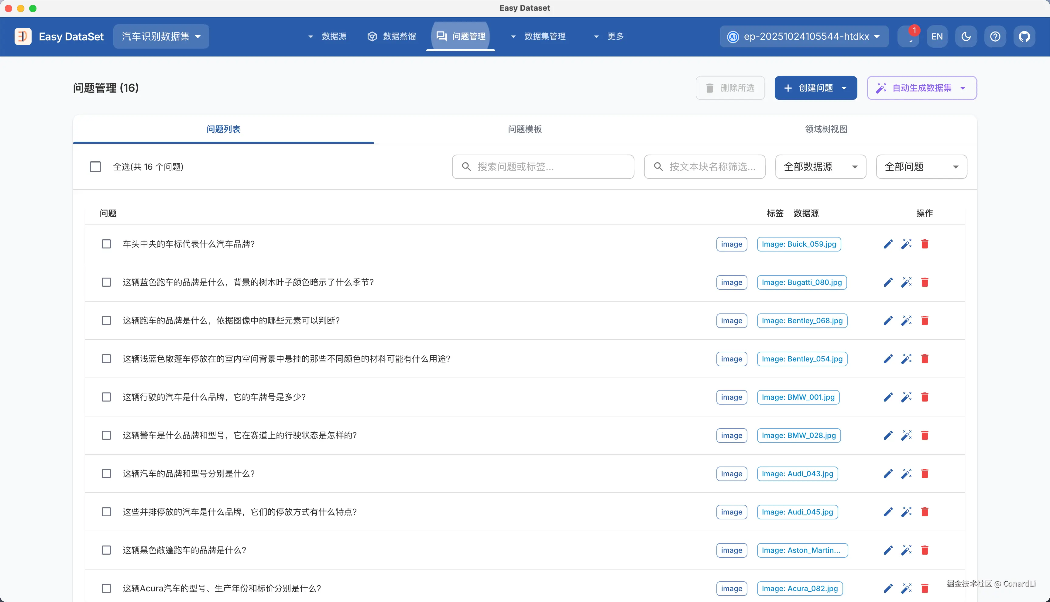 进入问题管理模块可以看到所有已经生成的问题,和普通问题的区别是数据源属性,普通问题关联的是文本块,而图片问题关联的是一张具体的图片: