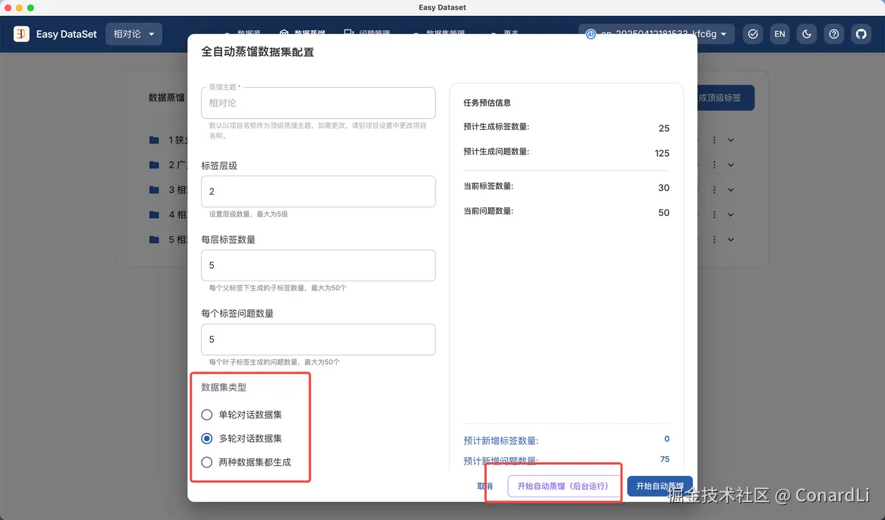 数据集可以选择生成单轮、多轮对话数据集或者两个都生成,注意这两种数据集的构建流程是完全不一样的,大家感兴趣可以到提示词模块去看一下,为了方便对比,我们选择两种数据集都生成。另外呢,在最新版本中,我们也支持了后台异步运行蒸馏任务。