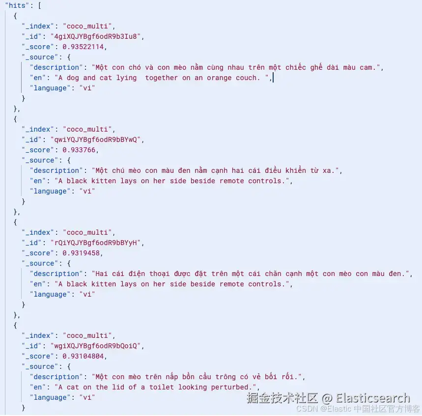 现在我们已经有了索引 coco_multilingual,执行搜索后将会得到多种语言的文档,其中 “en” 字段供我们参考: