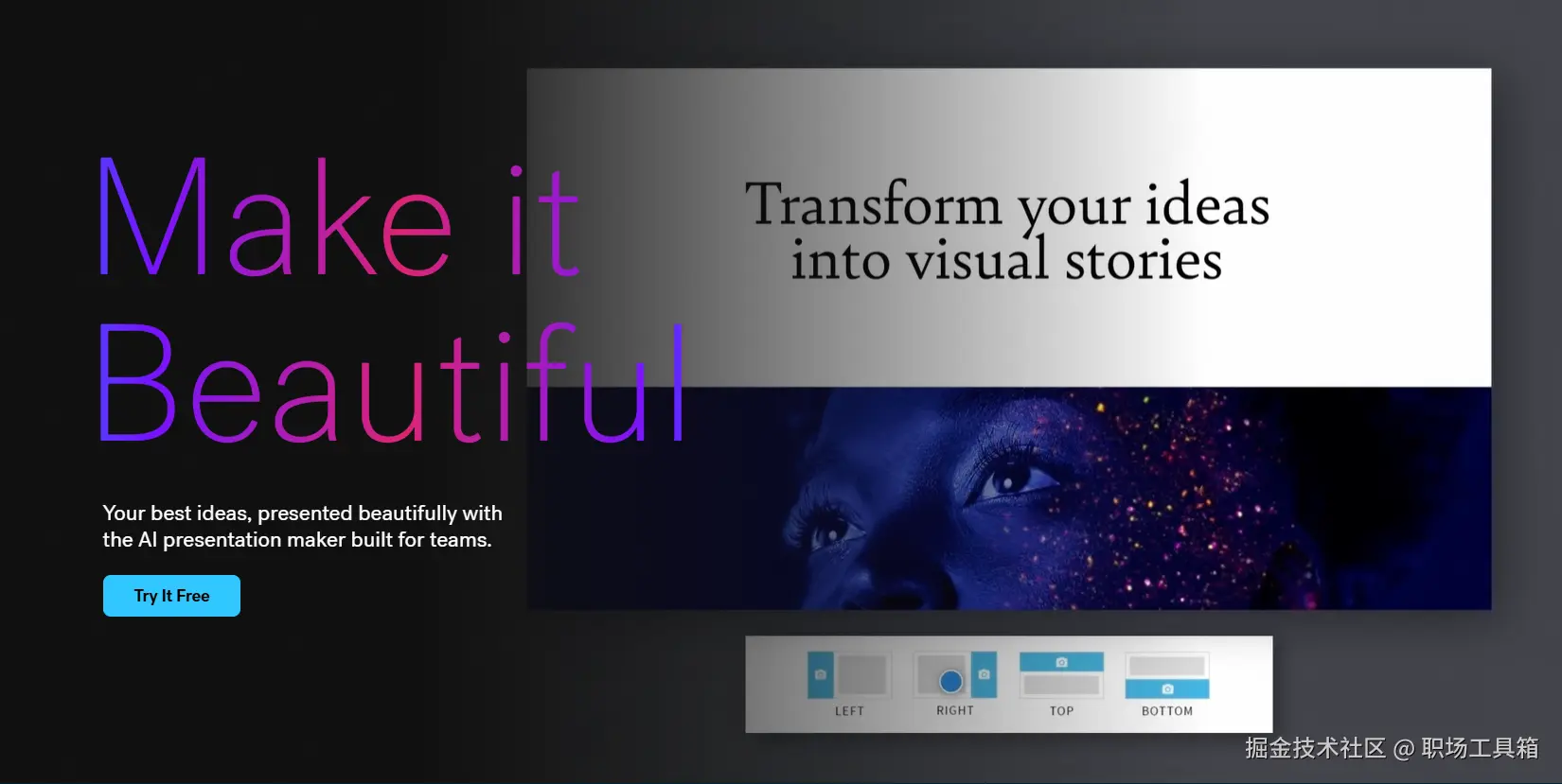 BeautifulAI自诞生之日起,就将“让设计变得简单而美观”作为其核心使命。它是一款极度专注于演示文稿美学和智能设计的AI工具,确保你的每一页幻灯片都无可挑剔。