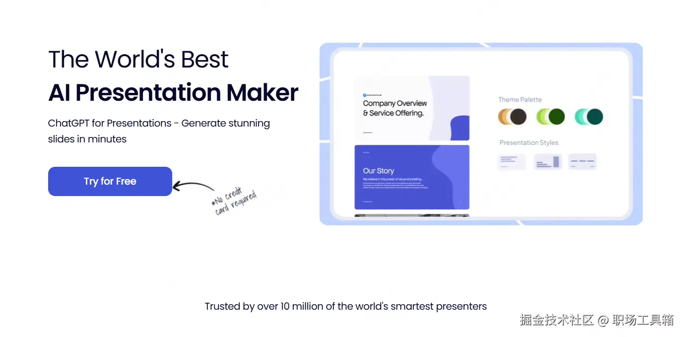 PresentationsAI号称是“为演示而生的ChatGPT”,它致力于将强大的语言模型能力与商业演示文稿的创作需求进行深度结合,是一款专为企业场景打造的效率引擎。