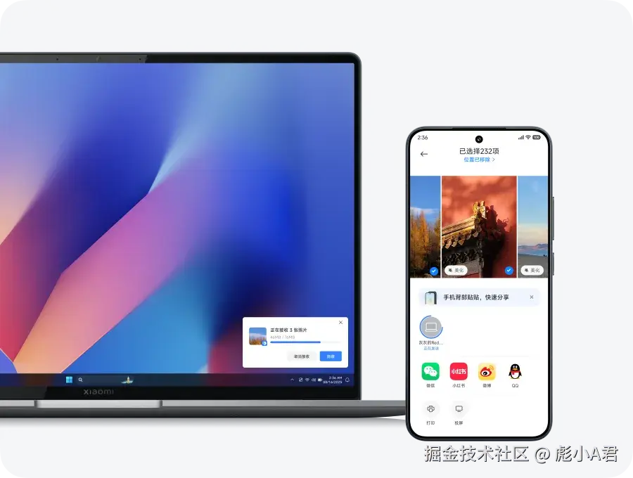 1. 小米手机分享给电脑:在相册或文件管理,选择图片或文件,点击发送,选择电脑设备进行发送