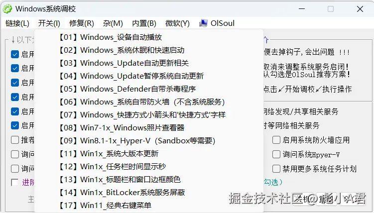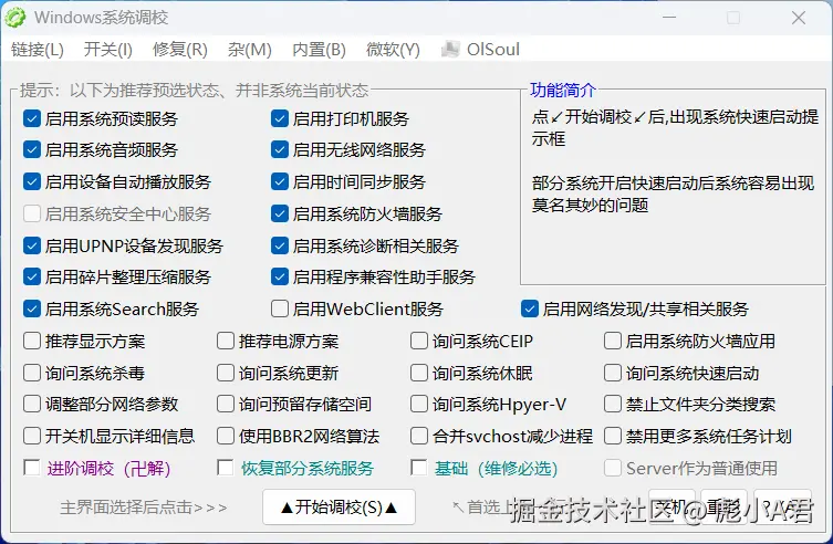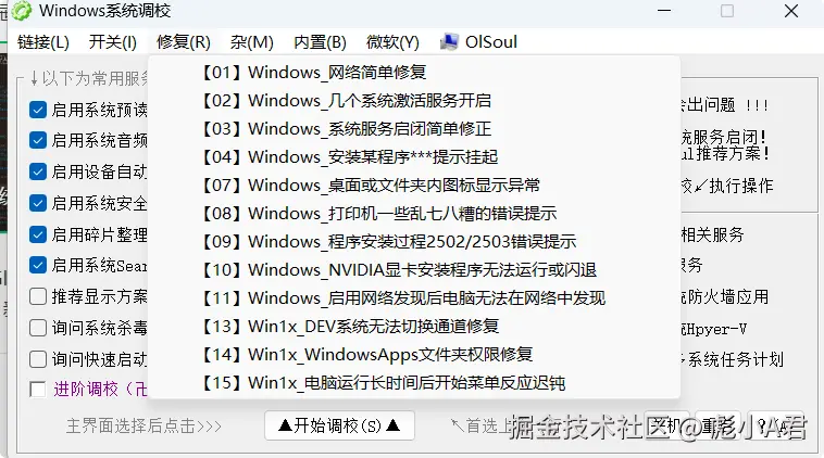 Windows 系统调校 彪小A君 2025-11-04 24 阅读1分钟 这是由开发者 OlSoul 制作的一款能够适配用于 Windows 各个系统的系统调校工具,功能非常多,包括网络修复、.NET 下载、显卡驱动下载、C++运行库下载等等。 夸某克 百某盘