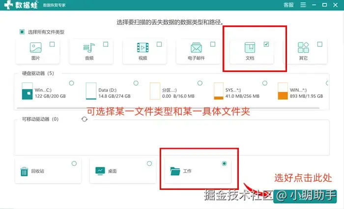步骤1: 在软件的首页设置好需要进行扫描的文件类型和电脑硬盘(或者是某一文件夹),选好后点击【扫描】,开启下一步。
