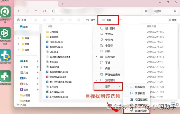 步骤2: 在【查看】的列表中选择【显示】,最后在【显示】的列表上点击【隐藏的项目】。
