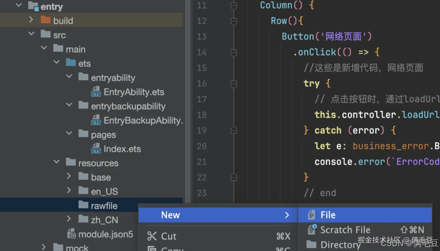 右击模块的rawfile目录 ,单击 New -> File,之后输入文件名local.html,在项目工程的entry/src/main/resources/rawfile目录中,创建local.html文件。