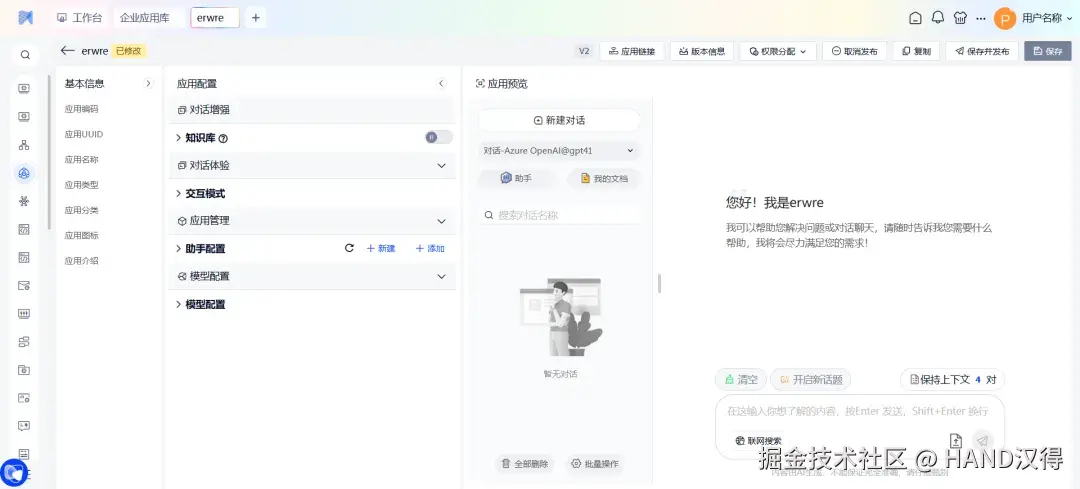 在汉得灵猿(大圣)AI中台中,用户可以灵活搭建智能体、企业知识助手、聊天助手等多种应用类型,通过丰富的配置能力,构建适用于不同场景的智能助手,从而为用户提升效率、优化流程、赋能业务创新。