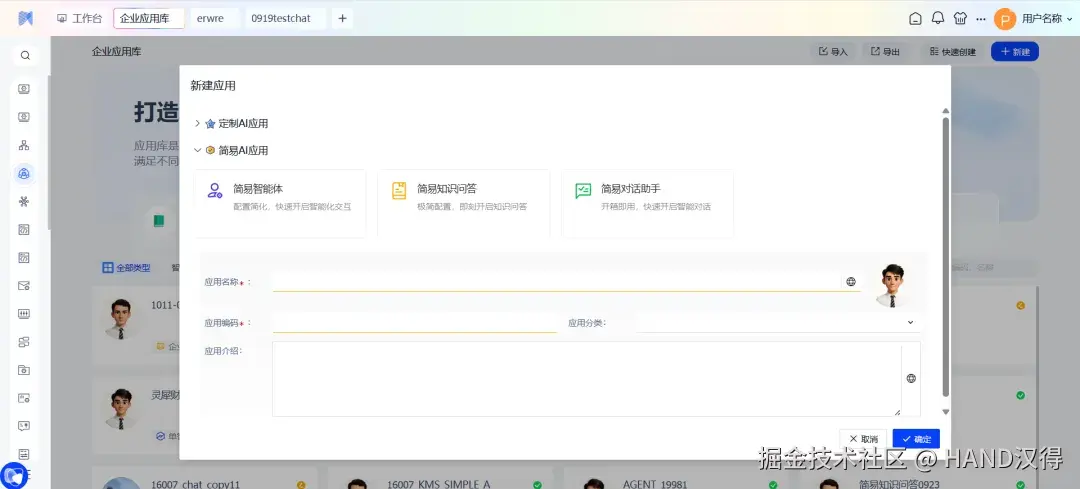 在企业应用库中点击“新建”,系统将提供两大分类选项:“定制AI应用”和“简易AI应用”。其中,“定制AI应用”包含以往已有的应用类型,而“简易AI应用”则汇集了本次新增的三款轻量化应用类型。