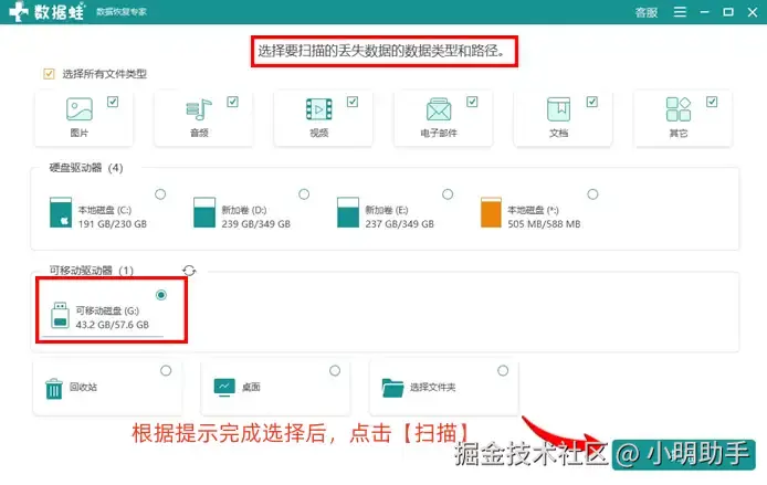 步骤1: 在软件的首页上,我们可以选择自己需要扫描的U盘和需要找回的数据类型,完成设置后按下【扫描】按钮;