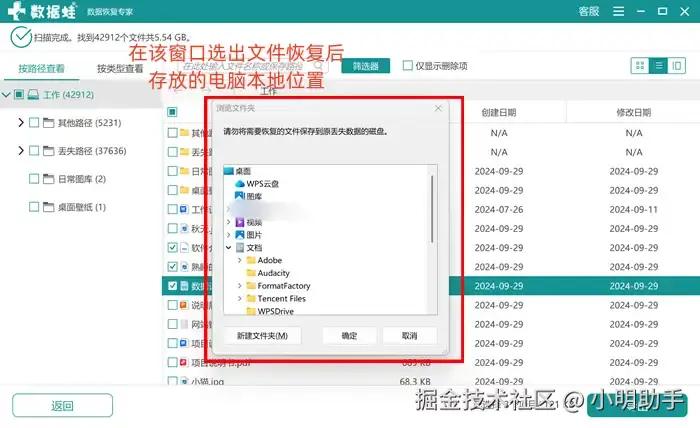 步骤3: 在【浏览文件夹】中,选择自己的文件恢复之后可以存放的位置,选好后点击【确定】。