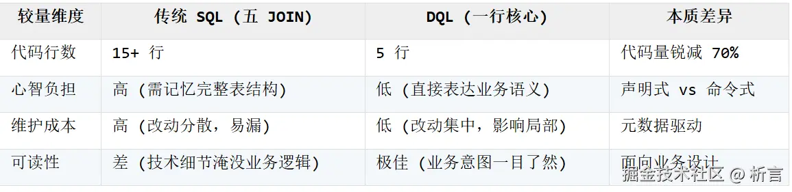 此乃“乾坤大挪移”心法之妙用。DQL 通过预定义的元数据(如同熟记的经脉图),将表间关联内化于无形: