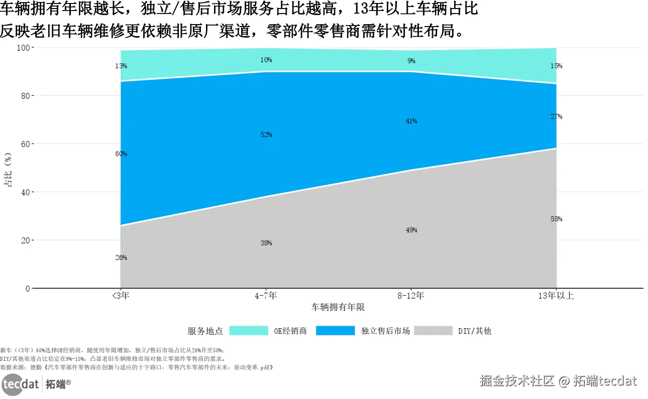 这种“渠道迁移”趋势在下图堆叠面积图中尤为明显:随车龄从“<3年”增至“13年以上”,独立售后市场占比从26%升至58%,OE经销商占比从60%降至27%,形成“此消彼长”的跷跷板效应。