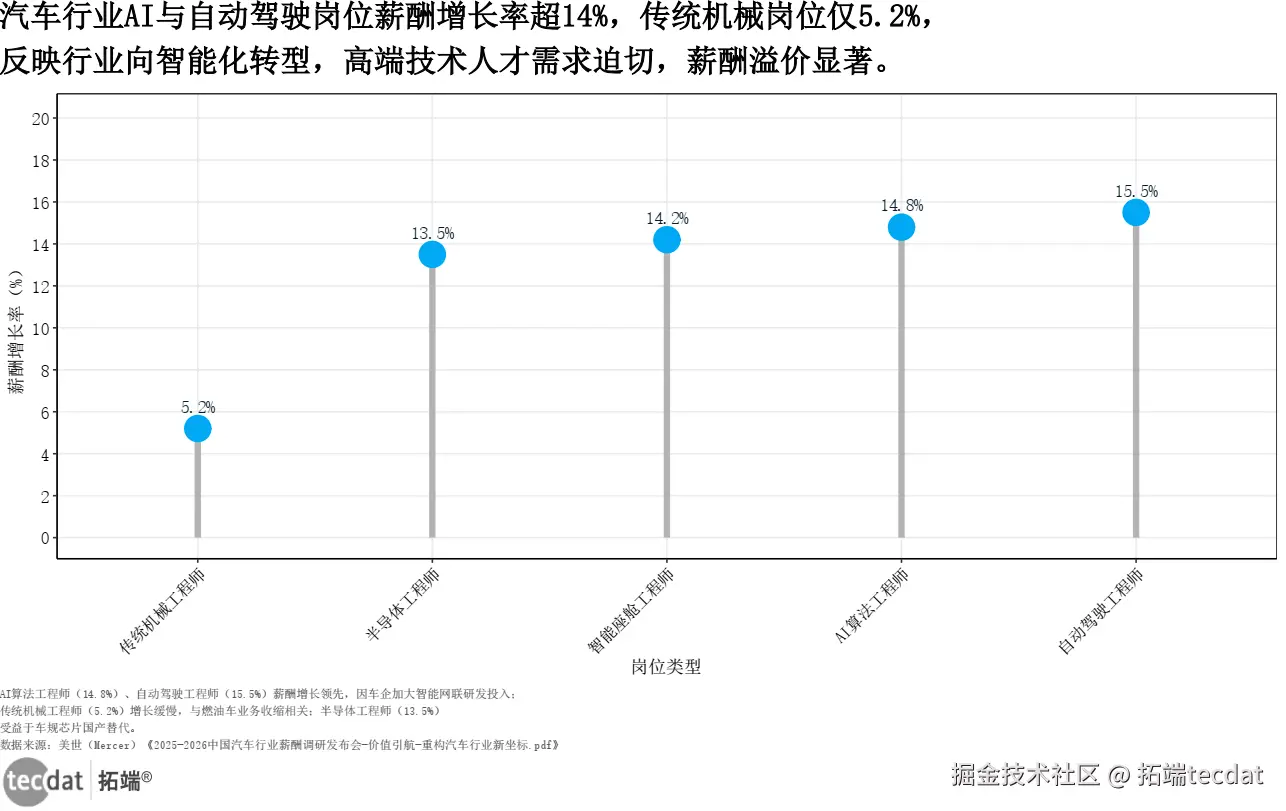下图垂直棒棒糖图直观呈现薪酬增长差距:自动驾驶工程师薪酬增速是传统机械工程师的3倍,智能技术人才成为行业“高薪群体”。