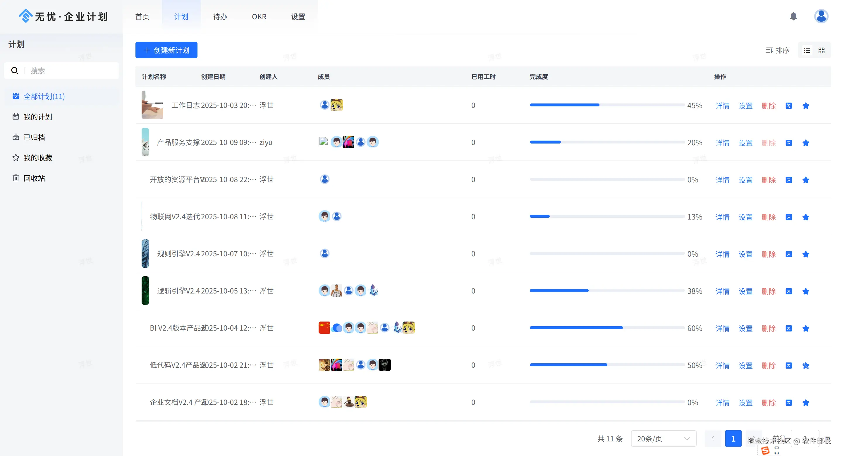 一个卡片为一个独立的计划,页面会展示计划的分类,计划的名称、完成度、用时这些简单的信息,用户可自行选择排序方式,点击列表展示按钮可切换为列表展示方式,如下图所示: