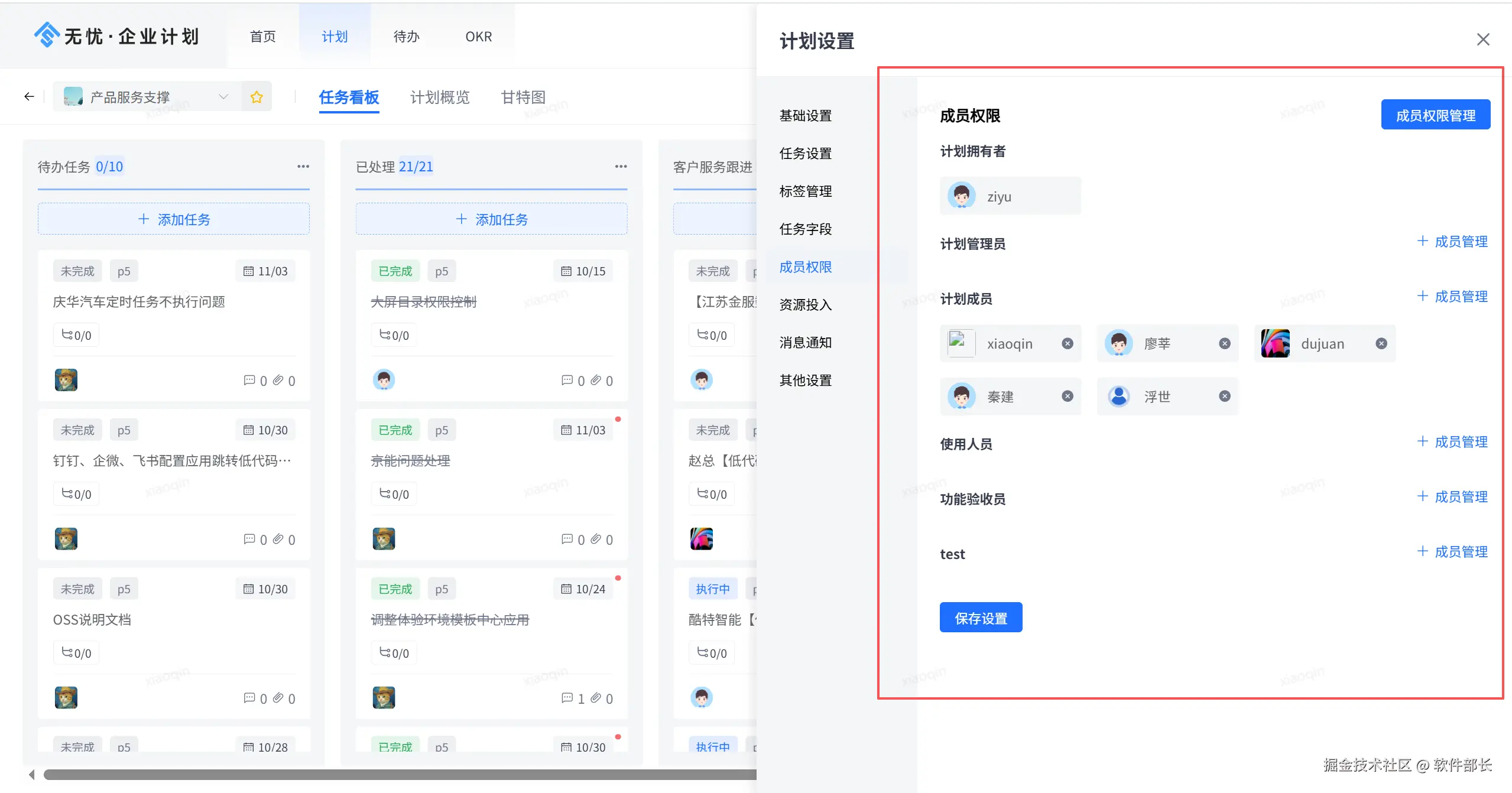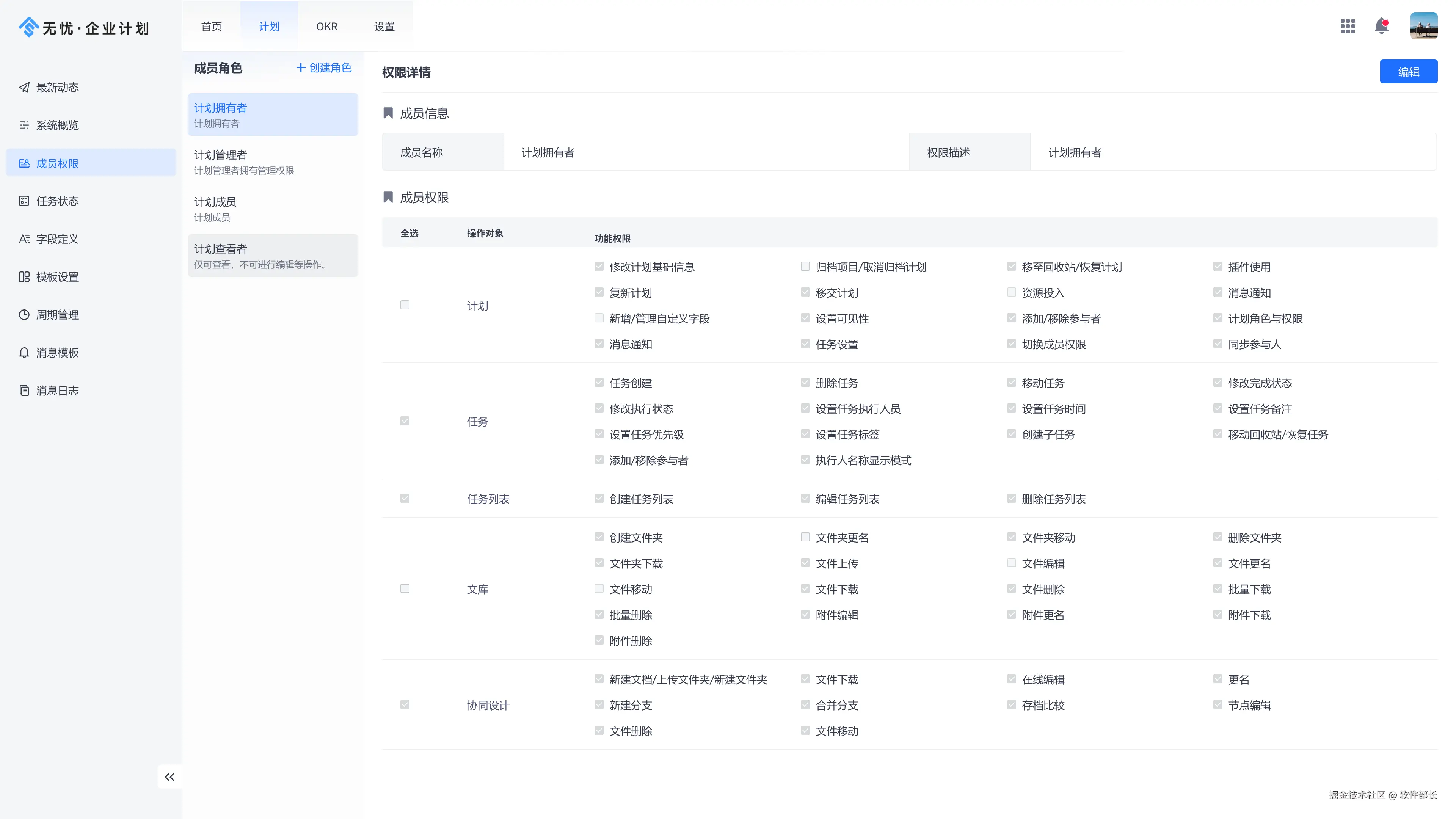 成员权限设置,可以配置计划中每个角色的计划、任务、任务列表、文科、协调设计的权限范围。