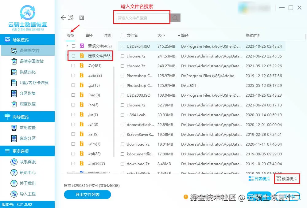 扫描完成后,利用软件的筛选功能。在“压缩文件”类型下展开 “rar”格式,也可以直接搜索文件名(如果记得的话),然后点击预览模式,以确认其可恢复性。