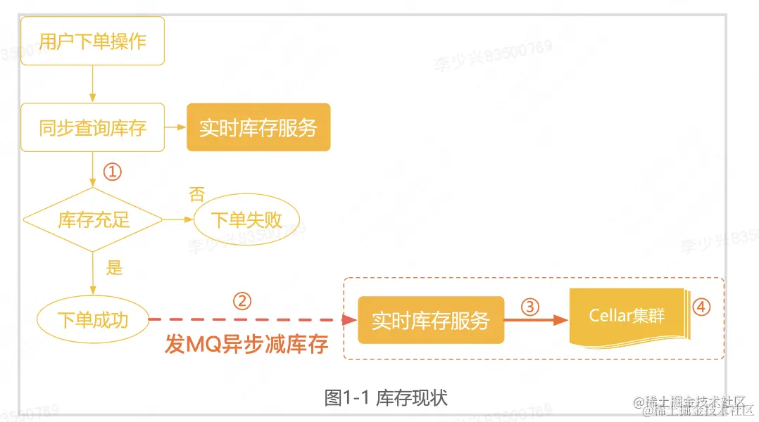 - 链路层问题— 如图1-1中②所示,下单成功后异步减库存,且订单未感知库存是否扣减成功。