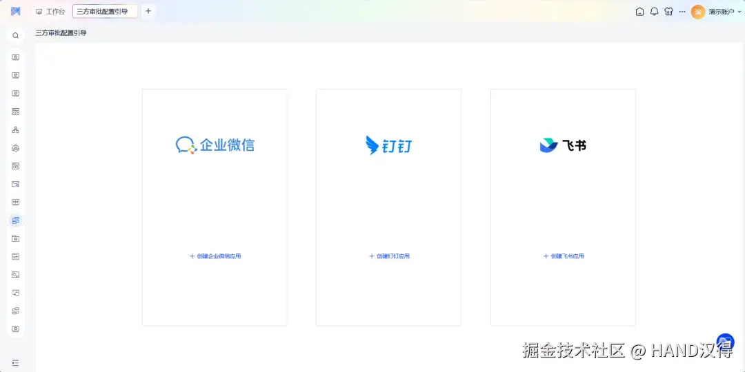 班翎新增三方应用配置指引功能,帮助您快速配置企业微信、飞书、钉钉的子应用,实现在对应的办公软件中审批待办事项、追踪个人提交的事项。